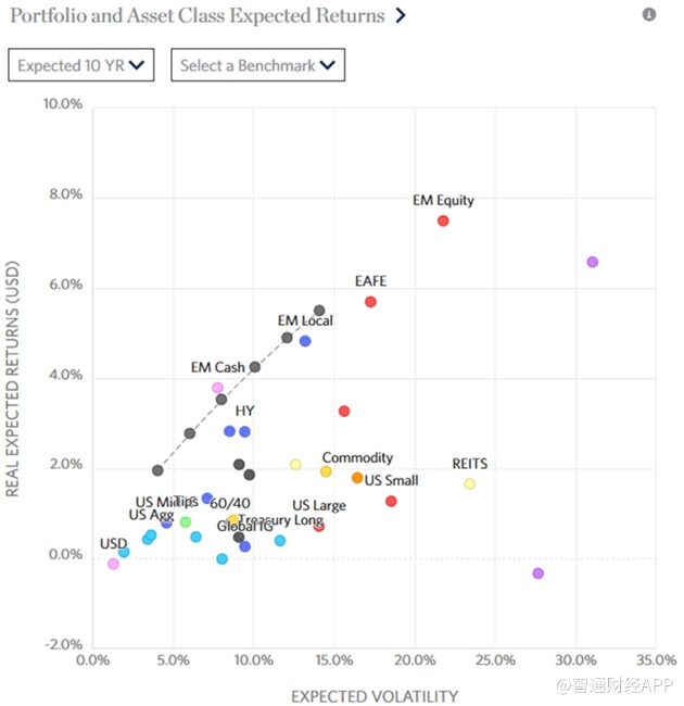 Rob Arnott的研究小组根据未来现金流和资产价格的变化,计算出了多个资产类别的10年预期回报。下图为风险回报散点图,纵轴为预期收益,横轴为预期波动。理想的投资(高回报,低波动性)应该出现在左上角。而不幸的是,只有新兴市场的股票落在这个区域。