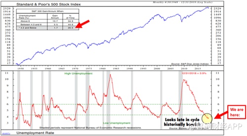 下一张图来自奈德·戴维斯研究公司(Ned Davis Research)。事实证明,失业率和股票回报率之间存在着显著的相关性。许多投资者可能认为低失业率意味着经济状况良好,股市走势也应该更加强劲。但出人意料的是,事实并不是这样,看回70年前的数据,那个时候美国的失业率总是低于4.3%,但标普500的年增长率也只有1.7%。John 认为,当经济处于成熟期时,失业率是最低的,而股票的回报率也处于平稳期,不会出现较大的波动。而现在,美国的失业率正处于较低水平。John 表示,股票的最佳购买时间应该是当失业率处于较高水平,市场恐慌指数上升的时候。