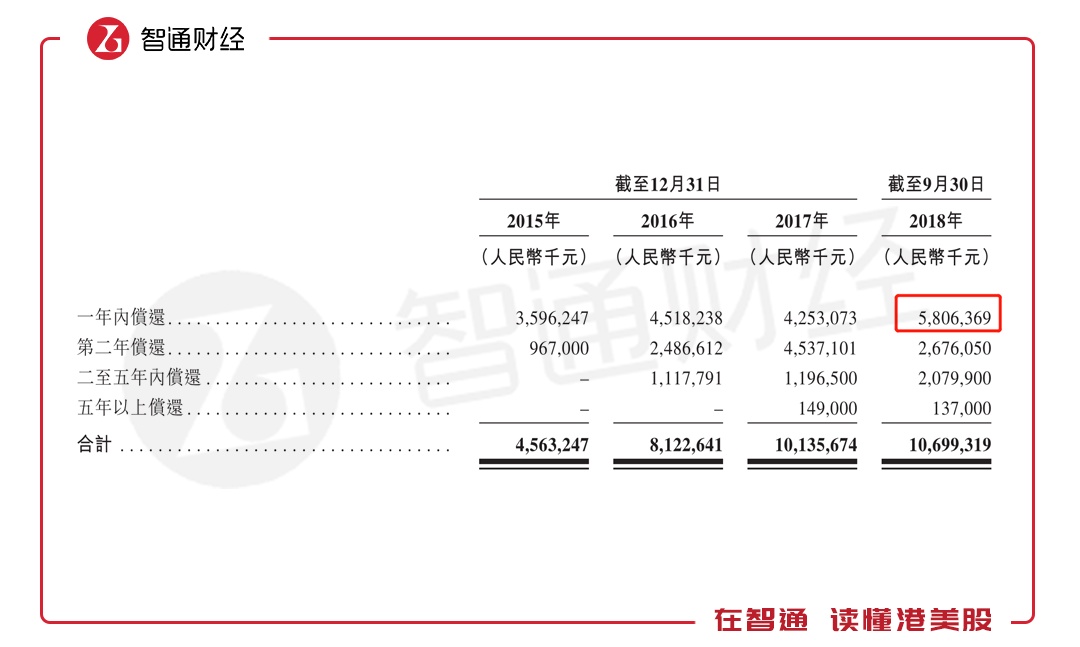 截至2018年9月30日,德信未偿还即期及非即期银行及其他借款总额由2017年底的101.36亿进一步升至107亿。