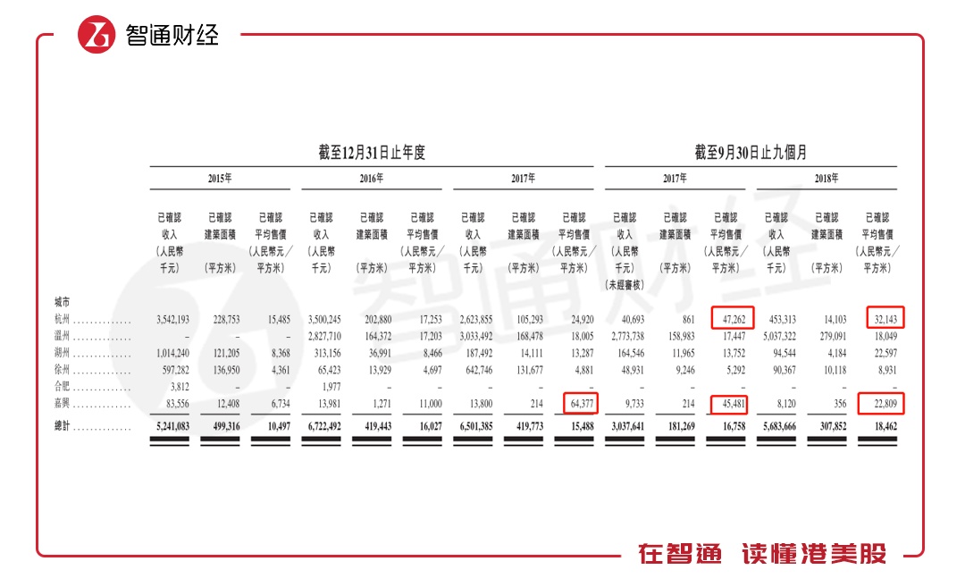 智通财经APP注意到,2017年全年,嘉兴地区已确认面积仅214平方米,单价高达6.437万/平,截至2018年前9月份,该地区已确认面积也只有356平,但单价已大幅降低至2.28万/平。