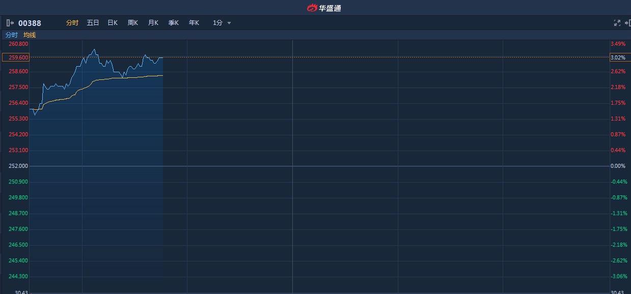智通财经APP获悉,港交所(00388)获大摩唱好,并看高至340港元。该股连续两日上涨,累计涨幅达7.28%。截至10时45分,涨3.02%,报价259.6港元,成交额13.11亿。