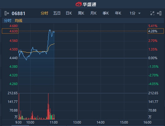 智通财经APP获悉,中国银河(601881)A股早盘直线封涨停,H股中国银河(06881)亦跟随上涨,截至11时2分,涨4.28%,报4.63港元,成交额达1.12亿港元。