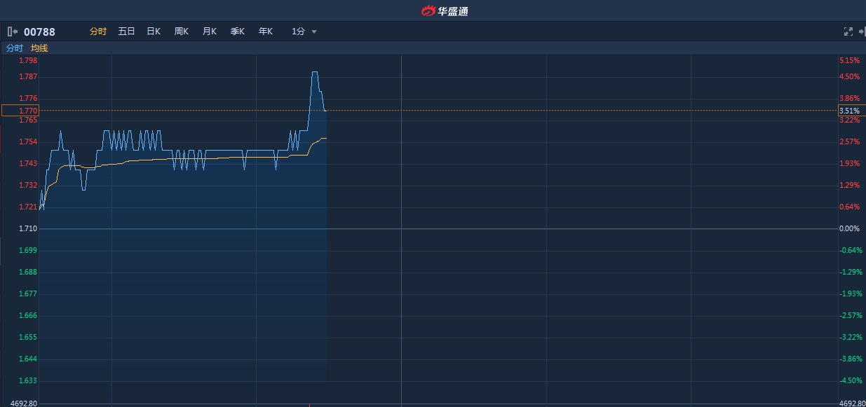 智通财经APP获悉,中国铁塔(00788)盘中一度涨至1.79港元,续创新历史高。截至11时28分,涨4.09%,报价1.78港元,成交额8.704亿。