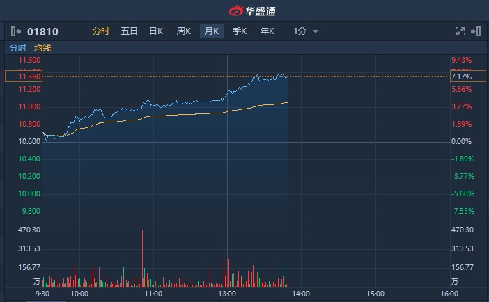 智通财经APP获悉,小米(01810)午后涨幅进一步扩大,截至13时49分,涨7.17%,报11.36港元,成交额达11.6亿港元。