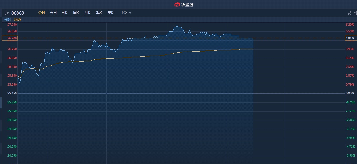 智通财经APP获悉,长飞光纤(06869)AH股齐涨,截至14时28分,涨4.91%,报价26.7港元,成交额2.083亿。