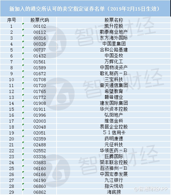 智通财经APP获悉,港交所今天公布认可的卖空指定证券名单,29只证券新加入,其中包括海底捞、药明康德、中国圣牧和指尖跃动等。2月15日正式生效。