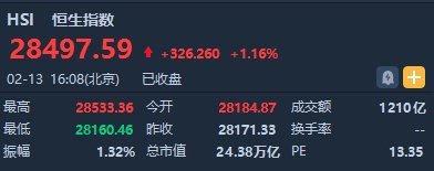 智通财经APP获悉,恒指早盘接近平开后,一路上攻,站上年线,量能有所放大。截至收盘,恒生指数涨326.26点或1.16%,报28497.59点,全日成交额达1210.12亿。国企指数涨1.4%,报154.45点,红筹指数涨2.13%,报4502.36点。