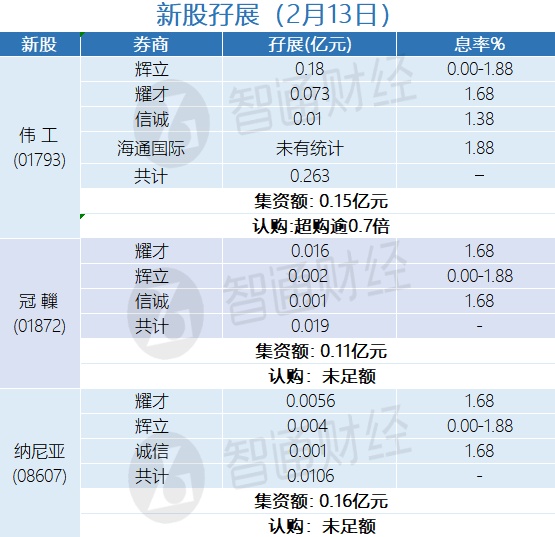 智通财经APP获悉,伟工(01793)、冠轈(01872)、纳尼亚(08607)正在招股中,截至2月13日,辉立、耀才等券商分别为其借出0.263亿、0.019亿和0.0106亿元孖展金。其中,冠轈、纳尼亚孖展未足额,伟工超购逾0.7倍。