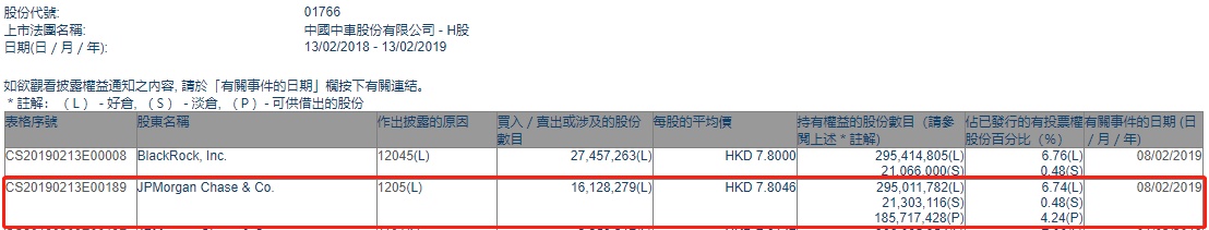 智通财经APP获悉,根据联交所资料显示,摩根大通于2月8日减持中国中车(01766)1612万股,每股作价7.8046港元,总值约1.26亿港元,最新持股数减至2.95亿股,最新持股比例减至6.74%。