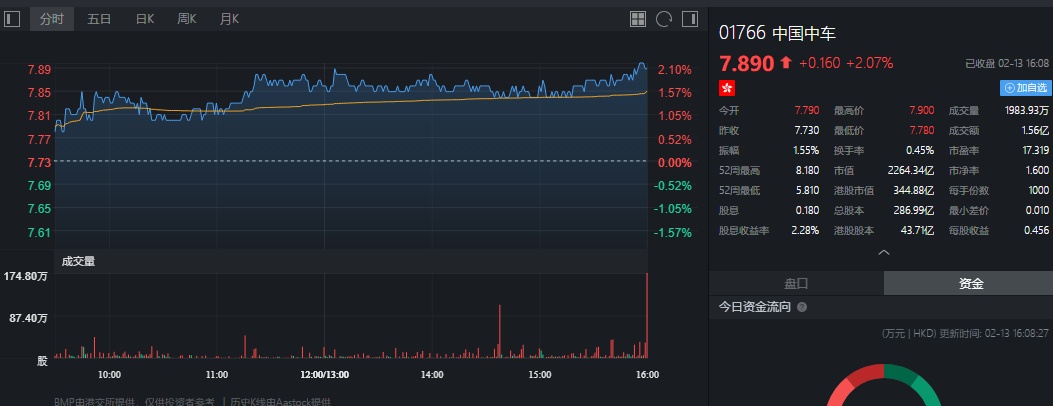 截至今日收盘,中国中车(01766)升2.07%,报7.89港元。