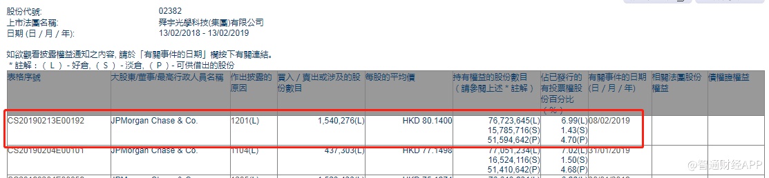 智通财经APP获悉,根据联交所资料显示,舜宇光学科技(02382)于2月8日被摩根大通减持154万股,每股作价80.14港元,总值1.23亿港元,最新持股数目7672万股,持股比例降至6.99%。
