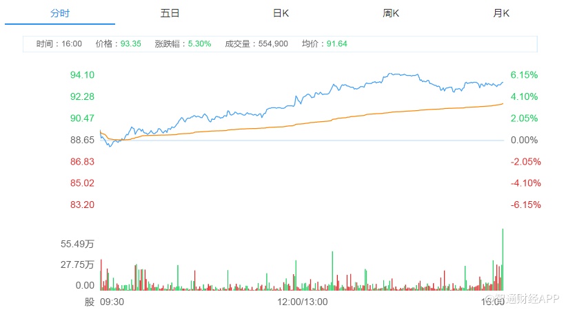 截至今日收盘,舜宇光学股价涨5.30%,报93.35港元。