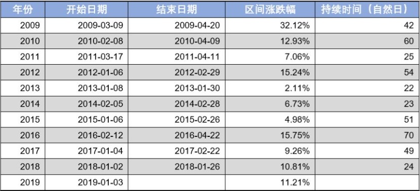 从以上统计数据可以明显看到春季躁动的存在,但是持续的时间和区间涨跌幅有明显的差异,持续时间最短的是2018年,一共24个自然日,最长的是2016年达到70个自然日。涨幅最小的是2013年,仅仅上涨2.11%,效果最不明显。