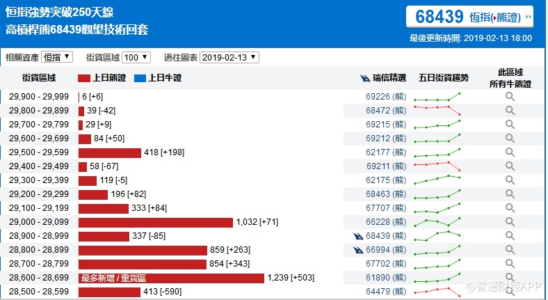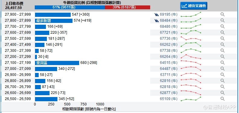 智通财经APP获悉,截至2月14日,恒指最新的牛熊街货比例61:39。从瑞信恒指牛熊证街货分布图中得到的数据显示,熊证街货重货区在28600-28699区间,该区间最新熊证数量为1239张,较上一交易日增加503张,最多新增区间也在此区间。牛证街货重货区在27100-27199区间,该区间最新牛证数量为680张,比上一交易日减少208张,最多新增在27800-27899区间,新增张数419张。