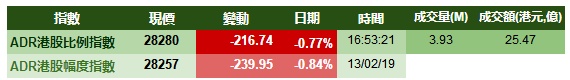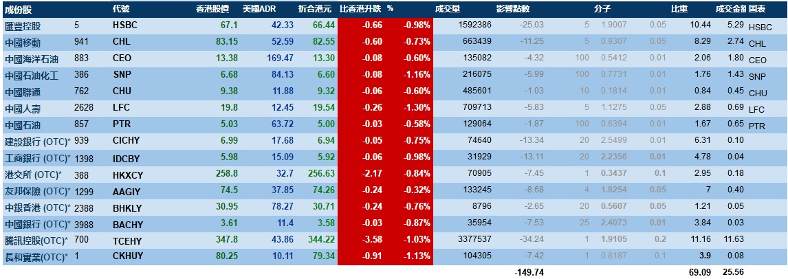 智通财经APP获悉,港股ADR指数全日表现偏软,按比例计算,收报28280点,跌216.7点。大型蓝筹全线受压,汇丰控股收报66.45元,较港收市跌0.65元;腾讯控股收报344.25元,较港收市跌3.55元。
