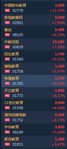 智通财经APP获悉,国务院鼓励企业和社会力量举办高质量职业教育。受行业政策利好推动,教育股全线大涨,截至9时47分,中国新华教育(02779)涨13.1%,报价2.85港元港元,新高教(02001)涨7.86%,中教控股(00839)涨7.38%,民生教育(01569)涨6.1%。