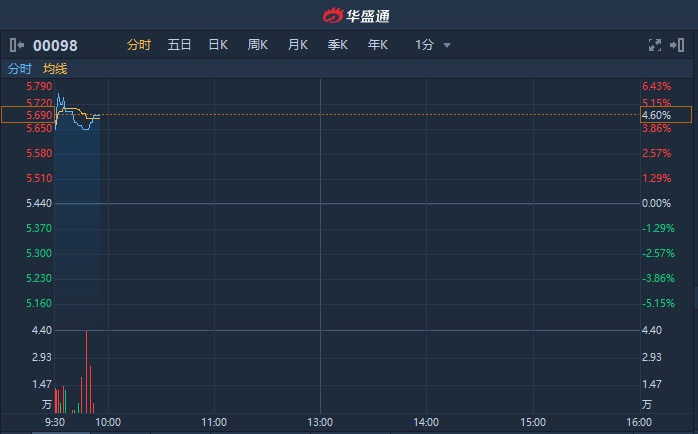 智通财经APP获悉,早盘大幅高开后,窄幅震荡,截至9时51分,涨4.6%,报5.69港元,成交额达158.6万港元。