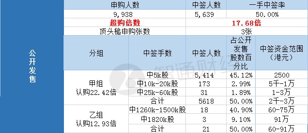 其中,公开配售申购人数9938,一手中签率50%,认购倍数17.68倍。