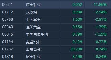 智通财经APP获悉,黄金股今日普跌,截至发稿,坛金矿业(00621)跌11.86%,龙资源(01712)跌2.94%,中国罕王(03788)跌2.91%,潼关黄金(00340)跌1.79%。