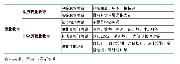 大体来说,职业教育大体是分成两个方向的:学历职教和非学历职教。学历职教一般是全日制的,一般是特定年龄的人在学校里接受的教育,包括中专,职高,技校等中等职业教育,也包括大专等高等职业教育。而非学历职教,我们认为主要分为四个方向:①单位招录考试,以考试为就职录取的主要方式,这是一个非常特殊的方式,在中国,主要是指公务员,②职业资格证考试,一般指就职某行业,需要的证书的考试培训,有相对简单的考试,如教师,证券从业,也有比较难的考试,如律师,注册会计师等,③其他资格证考试:除了从业证书考试外,还有一些非从业证书的考试,比如CFA,ACCA,税务师,人力资源管理师等,这一类证书不是就职必须的证书,但是在求职和职业发展上有锦上添花的作用,也有很多人去考,④职业技能培训:包括耳熟能详的达内IT培训,新东方厨师培训等,都是这个范畴的,其中驾驶培训是一个比较特殊的职业培训类别,因为其既是技能培训,又有相应的证书,我们暂且将其划到职业技能培训里面。
