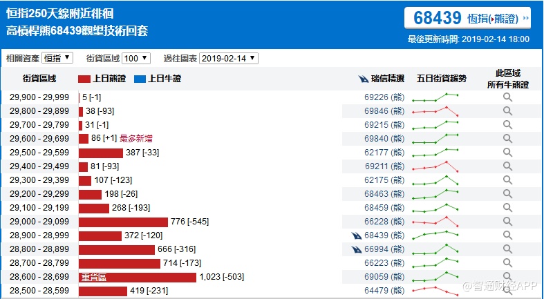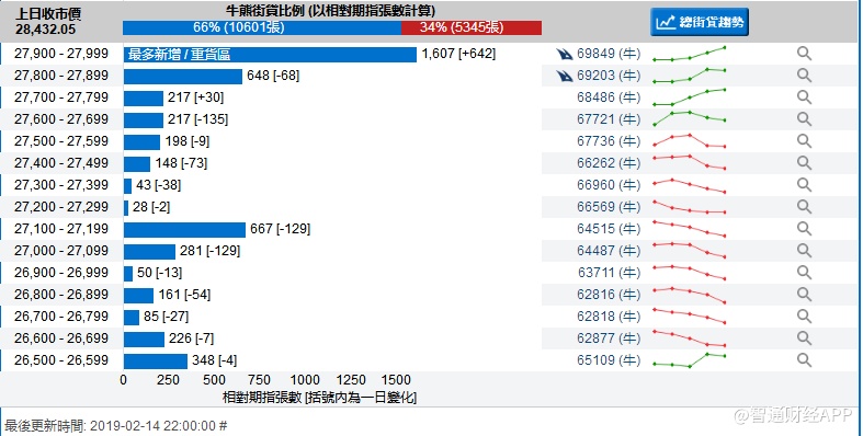 智通财经APP获悉,截至2月14日,恒指最新的牛熊街货比例66:34。从瑞信恒指牛熊证街货分布图中得到的数据显示,熊证街货重货区在28600-28699区间,该区间最新熊证数量为1023张,较上一交易日减少503张,最多新增区间在29600-29699区间。牛证街货重货区在27900-27999区间,该区间最新牛证数量为1607张,比上一交易日增加642张。