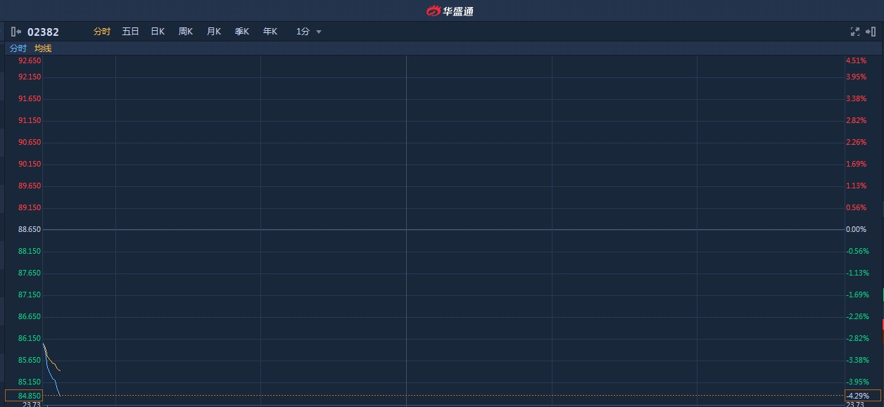 智通财经APP获悉,舜宇光学(02382)遭富瑞看淡至62港元,评级“跑输大市”。该股连续两个交易日累计跌幅近一成,截至9时36分,跌4.29%,报价84.85港元,成交额1.388亿。