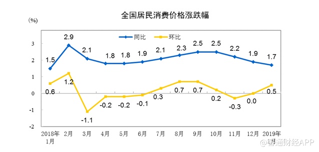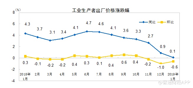 智通财经APP获悉,国家统计局今天发布了2019年1月份全国居民消费价格指数(CPI)和工业生产者出厂价格指数(PPI)数据。其中,CPI同比增1.7%,预期1.9%,前值1.9%,该数据已连续两月处于“1时代”;PPI同比 0.1%,连续第二个月创2016年9月以来最低,预期 0.3%,前值 0.9%。