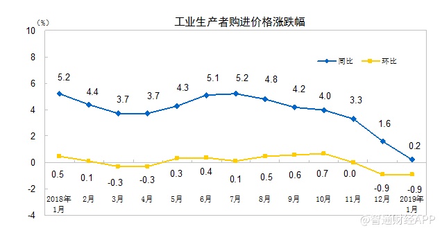 2019年1月份,全国工业生产者出厂价格同比上涨0.1%,环比下降0.6%;工业生产者购进价格同比上涨0.2%,环比下降0.9%。