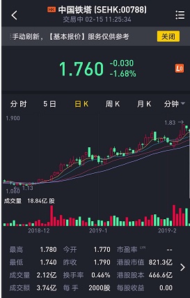 截至发稿,中国铁塔(00788) 跌1.68%,报1.76港元。