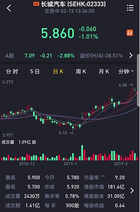 截至发稿,长汽(02333)跌1.01%,报5.86港元。