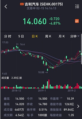 截至发稿,吉利汽车(00175)跌4.87%,报14.06港元。