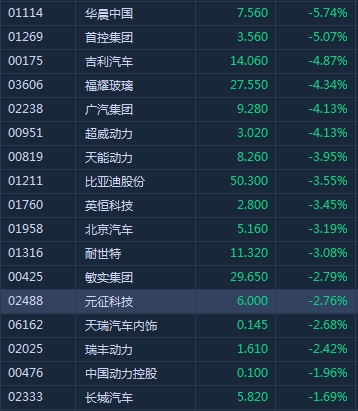 智通财经APP获悉,汽车股今日全线走弱,华晨中国(01114)领跌板块。截至15时38分,华晨中国跌5.74%,报价7.56港元,吉利汽车(00175)跌4.87%,广汽集团(02238)跌4.13%,北京汽车(01958)跌3.19%,长城汽车(02333)跌1.69%。