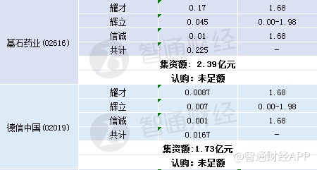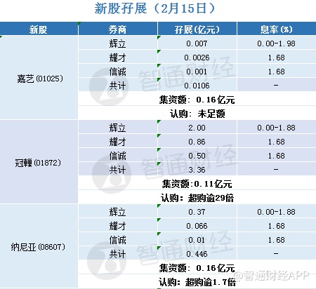 智通财经APP获悉,嘉艺(01025)、冠轈(01872)、纳尼亚(08607)、基石药业(02616)、德信中国(02019)正在招股中,截至2月15日,辉立、耀才等券商分别为其借出0.0106亿、3.36亿、0.446亿、0.225亿和0.0167亿元孖展金。其中,嘉艺、基石药业、德信中国孖展未足额,冠轈超购逾29倍、纳尼亚超购逾1.7倍。