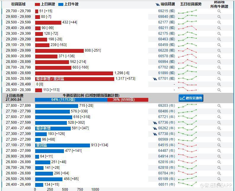 智通财经APP获悉,截至2月15日,恒指最新的牛熊街货比例64:36。从瑞信恒指牛熊证街货分布图中得到的数据显示,熊证街货重货区在28500-28599区间,该区间最新熊证数量为1317张,较上一交易日增加573张,最多新增区间在同一区间。牛证街货重货区在27400-27499区间,该区间最新牛证数量为913张,比上一交易日增加134张。最多新增在27400-27499,新增347张。