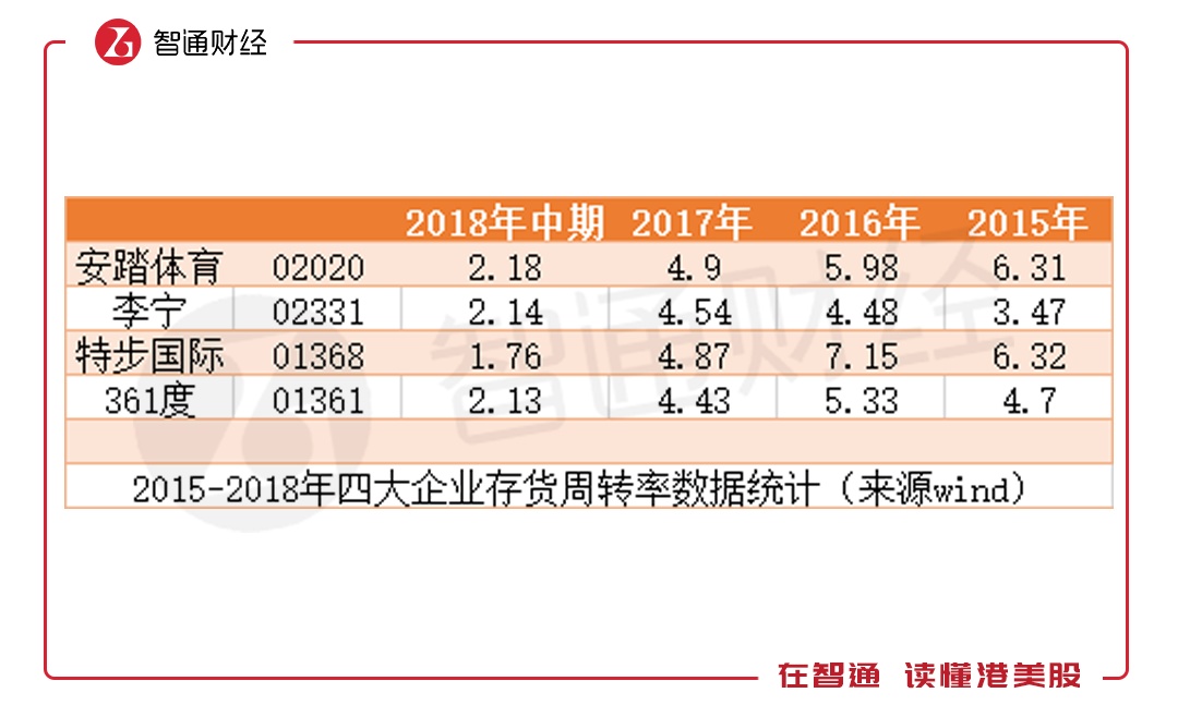 2015年时,李宁虽扭亏为盈,但在存货周转率上,与竞争对手仍相差较远。李宁当时的存货周转率仅3.47次,而安踏体育(02020)为6.31次,特步国际(01368)为6.32次,连361度(01361)也有4.7次。