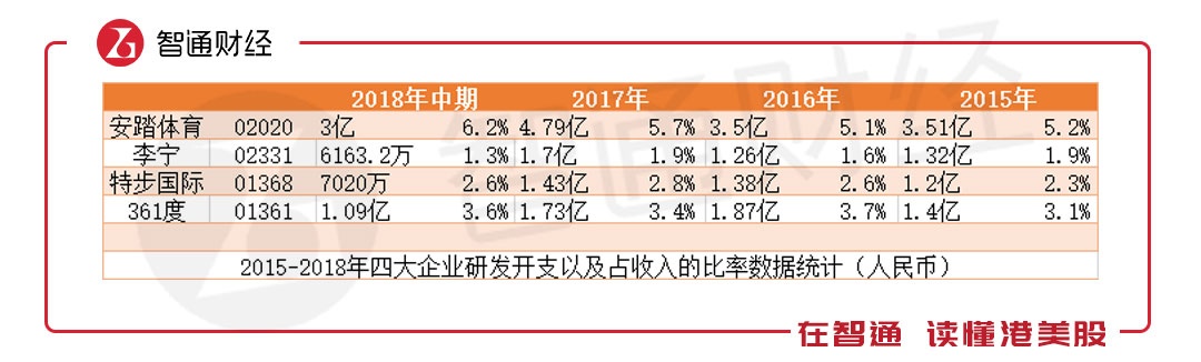 从2015-2018年中期,李宁的研发支出一直是国内四大体育用品企业中最低的。以2018年上半年为例,李宁的研发支出为6163.2万元,占当期收入的比率仅为1.3%,而安踏研发支出高至3亿元,就连特步、361的研发支出比率都高于李宁。