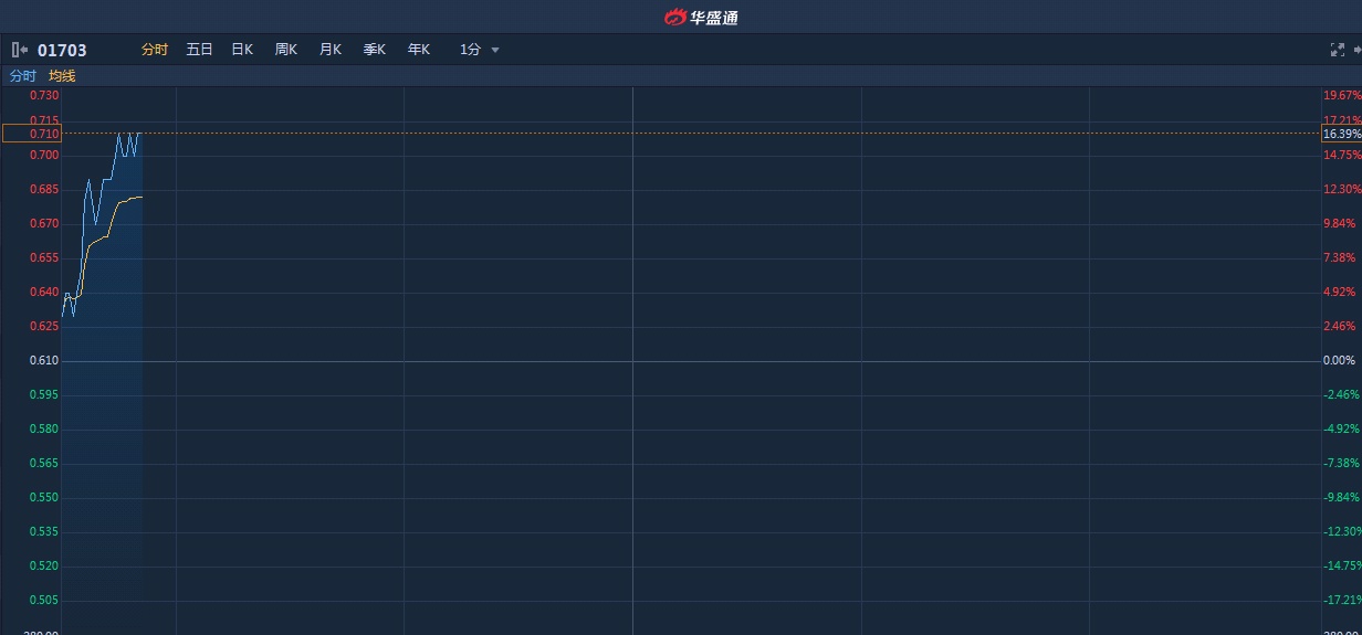 智通财经APP获悉,首沣控股(01703)上市次日,盘中一度涨至0.72港元,续创上市新高。截至9时50分,涨16.39%,报价0.71港元,成交额1165万。