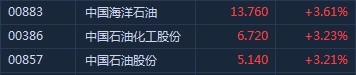 智通财经APP获悉,受国际原油价格持续走高刺激,港股石油股全线大涨。截至9时55分,中海油(00883)涨3.61%,报价13.76港元,中石化(00386)涨3.23%,中石油(00857)涨3.21%。