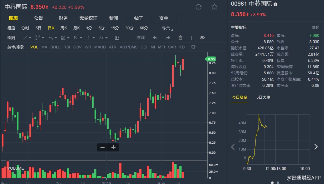 截至发稿,中芯国际(00981)升3.99%,报8.350港元。
