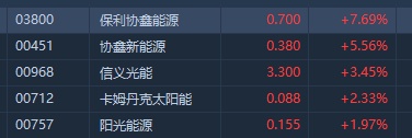 智通财经APP获悉,光伏太阳能股今日普涨,截至发稿,保利协鑫能源(03800)涨7.69%,协鑫新能源(00451)涨5.56%,信义光能(00968)涨3.45%,阳光能源(00757)涨1.97%。
