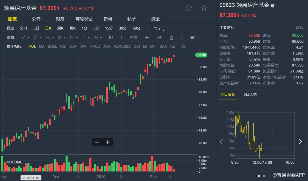 截至发稿,领展(00823)升0.81%,报87.30港元。