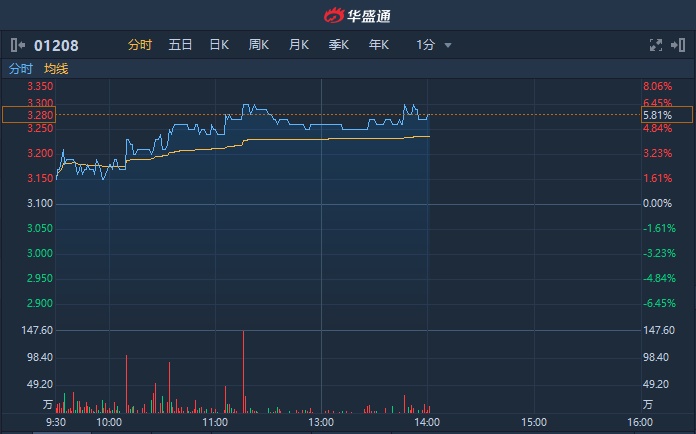 智通财经APP获悉,五矿资源(01208)今日高开高走,截至14时整,涨5.81%,报3.28港元,成交额达6142万港元。