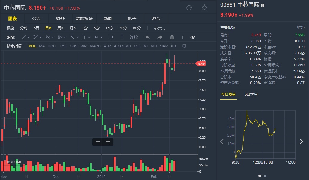 截至发稿,中芯国际(00981)涨1.99%,报8.190港元。