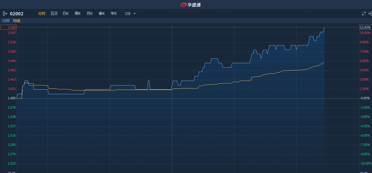 智通财经APP获悉,阳光纸业(02002)午后股价快速拉涨,尾盘涨幅超10%。截至15时26分,涨11.43%,报价1.56港元,成交额634.3万。