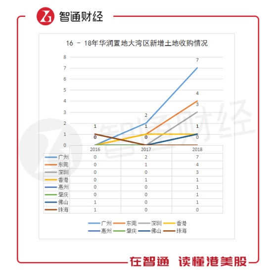 从华润置地近三年的拿地数据来看,公司在大湾区内的发展也是呈指数型增长的。据智通财经APP整理公开数据显示,2016年华润置地在粤港澳大湾区内的城市收购地块仅2起,2017年共四起。