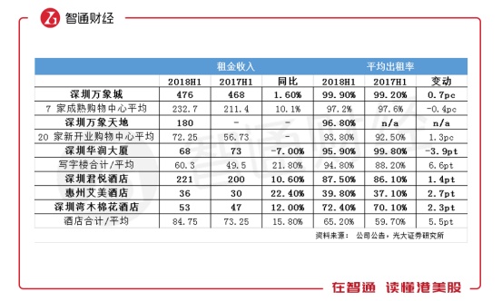 就运营情况来看,购物中心及写字楼运营数据均大幅优于平均水平,其中购物中心租金收入甚至高于平均水平2倍以上。酒店运营数据则层次不齐,仅君悦酒店一家高于平均水平。