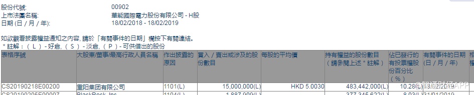 智通财经APP获悉,根据联交所资料显示,重阳集团于2月18日增持华能国际电力(00902)1500万股,每股作价5.0030港元,总值7504.50万港元,最新持股数增至4.83亿股,最新持股比例增至10.28%。