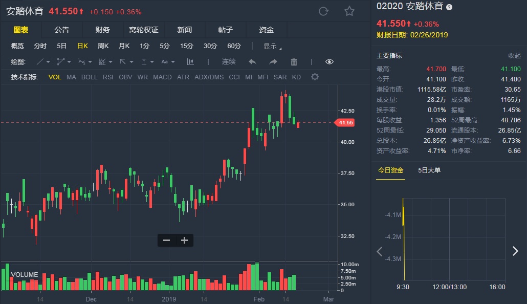 截至发稿,安踏体育(02020)升0.36%,报41.550港元。