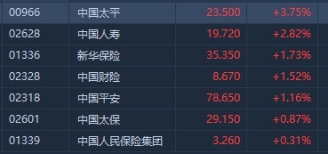 智通财经APP获悉,內险股早盘普涨,截至发稿,中国太平(00966)涨3.75%,中国人寿(02628)涨2.82%,新华保险(01336)涨1.73%,中国财险(02328)涨1.52%,中国平安(02318)涨1.16%。