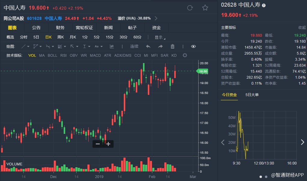 截至发稿,中国人寿(02628)涨2.19%,报19.600港元。